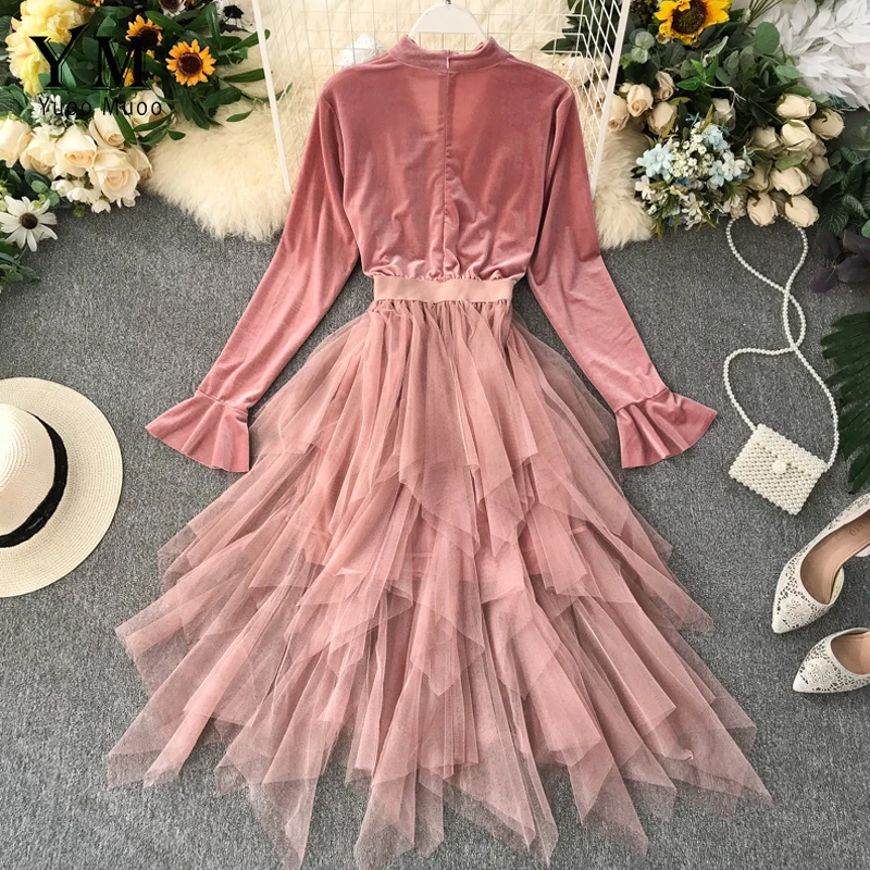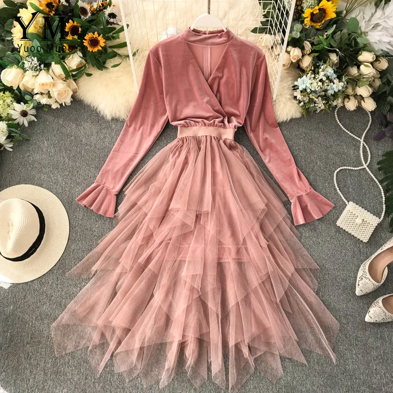 New Product YuooMuoo Good Quality Comfy Romantic Women Pink Party Dress 2019 Autumn Winter Halter V Neck Irregu