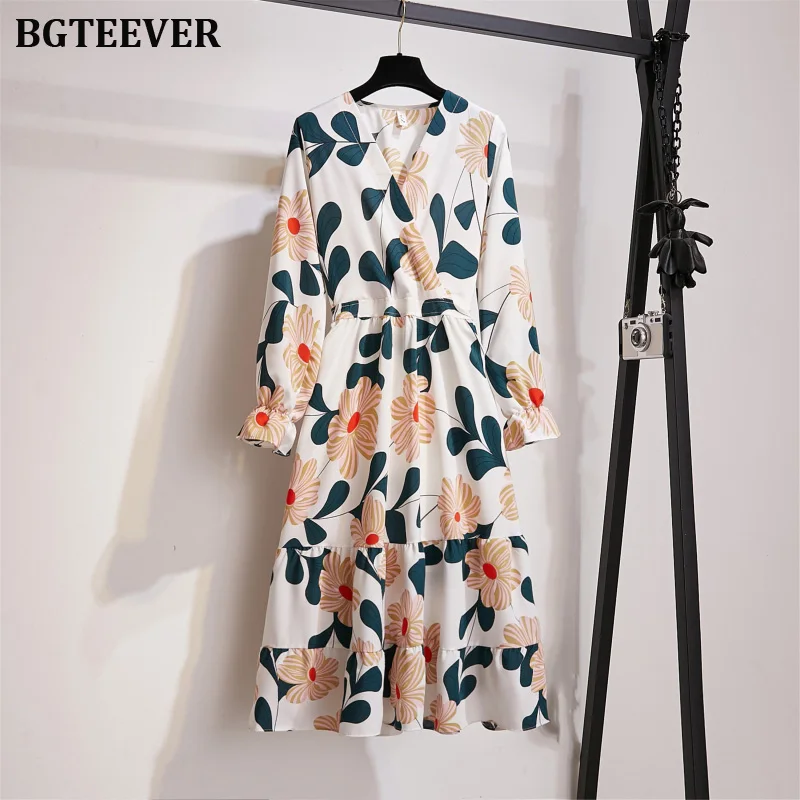 SALE BGTEEVER A-line Multicolor Elastic Waist Flower Print Women Dress 2019 Autumn V Neck Fit and Flare